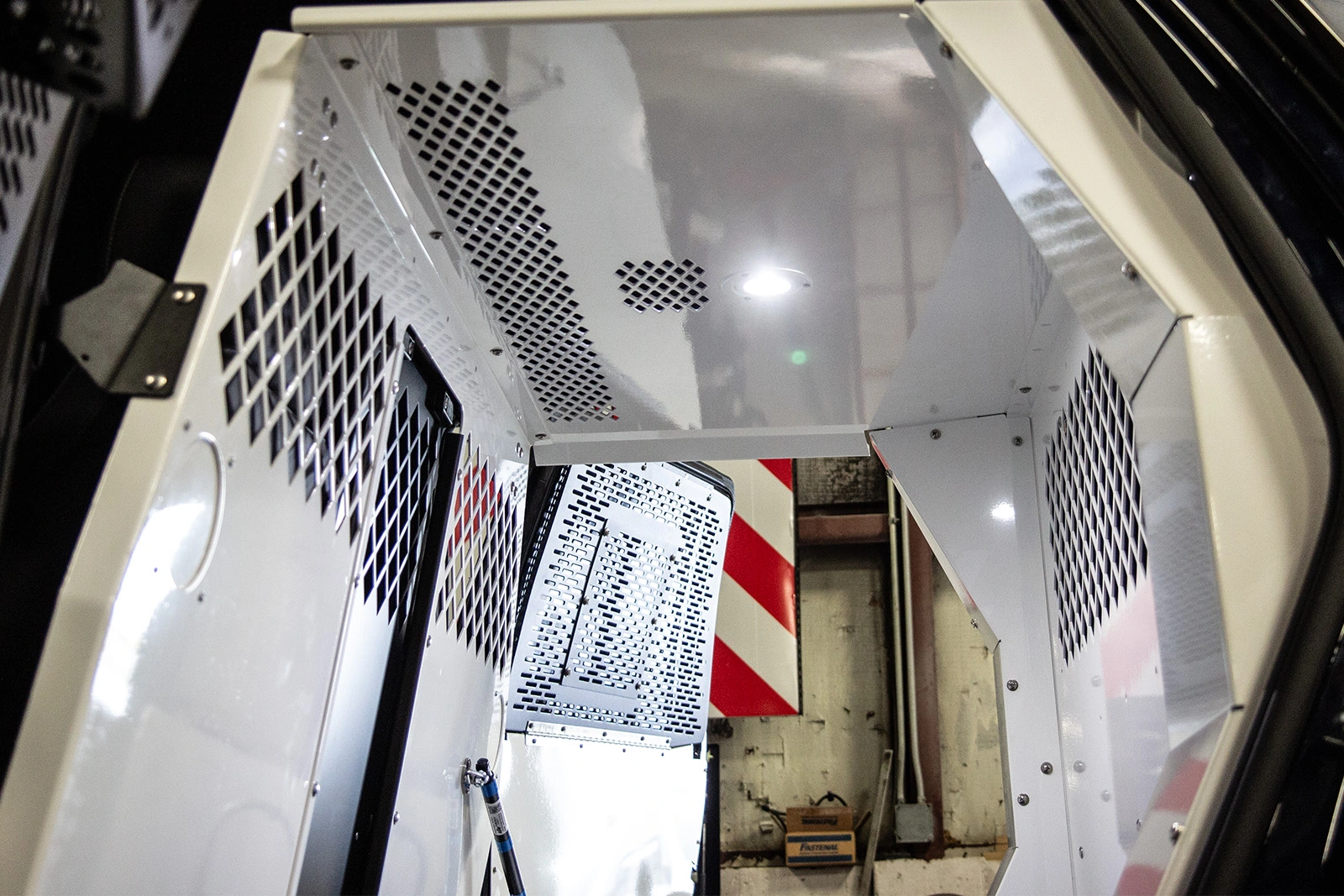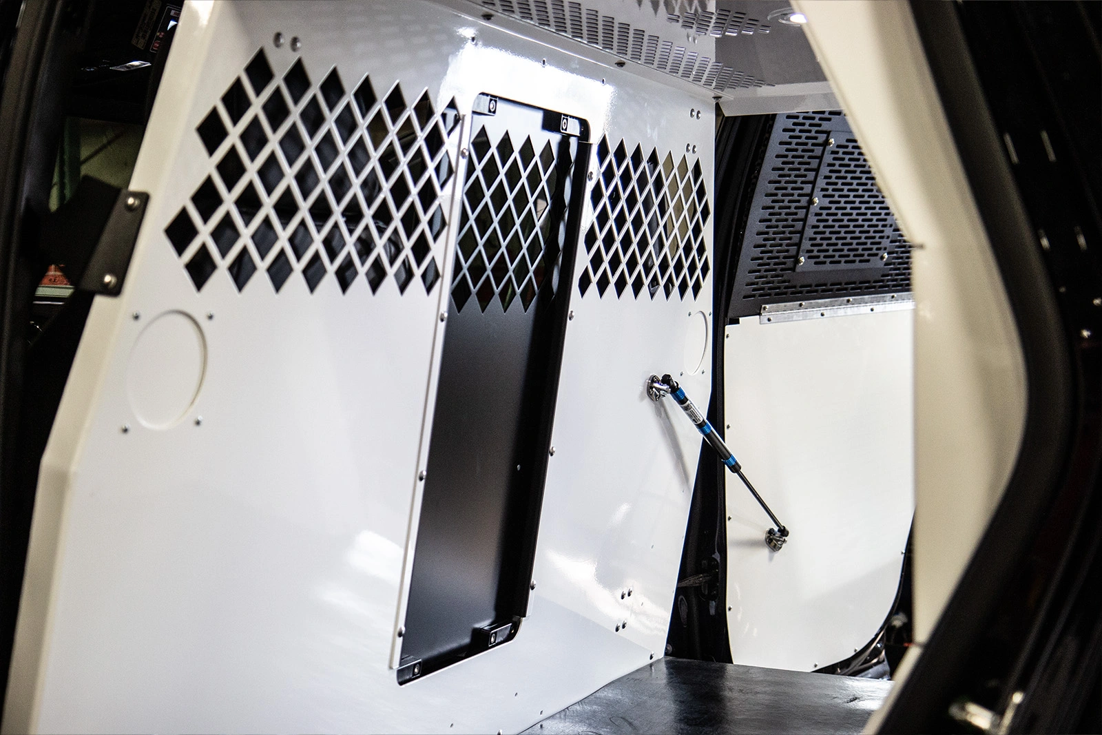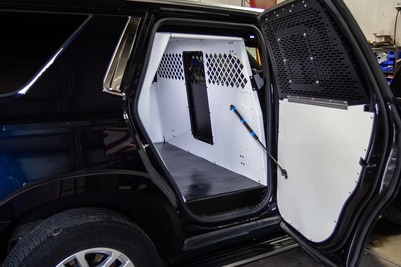 Our team installed a Havis aluminum full K9 insert with matte black vinyl on the front panel to prevent driver silhouette and improve handler safety. The AceK9 Hot & Pop Pro system was added to monitor kennel temperature and automatically roll down windows, start a fan, and activate lights or horn if conditions become unsafe. An AceK9 WatchDog System provides cellular connectivity and real-time data through a mobile app, allowing users to monitor temperature, ignition, and alarm status remotely. It also sends alerts via text, app, or automated call to designated personnel, ensuring maximum safety for both the K9 and handler.